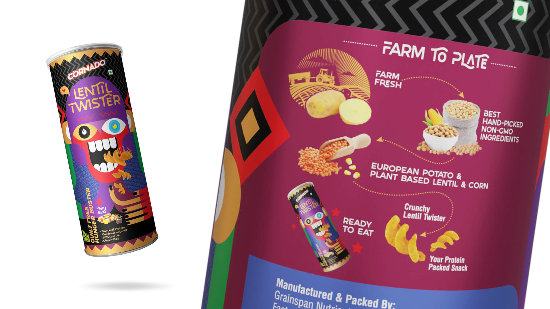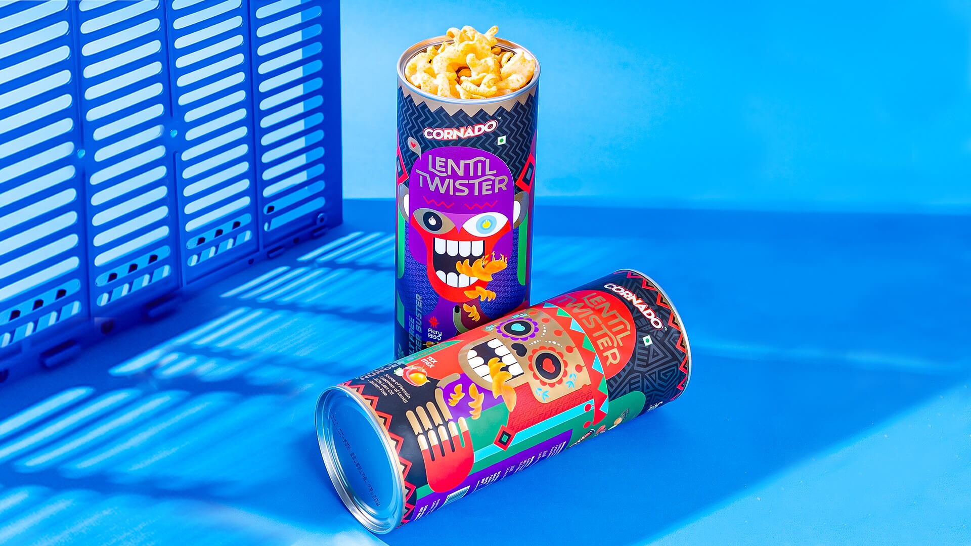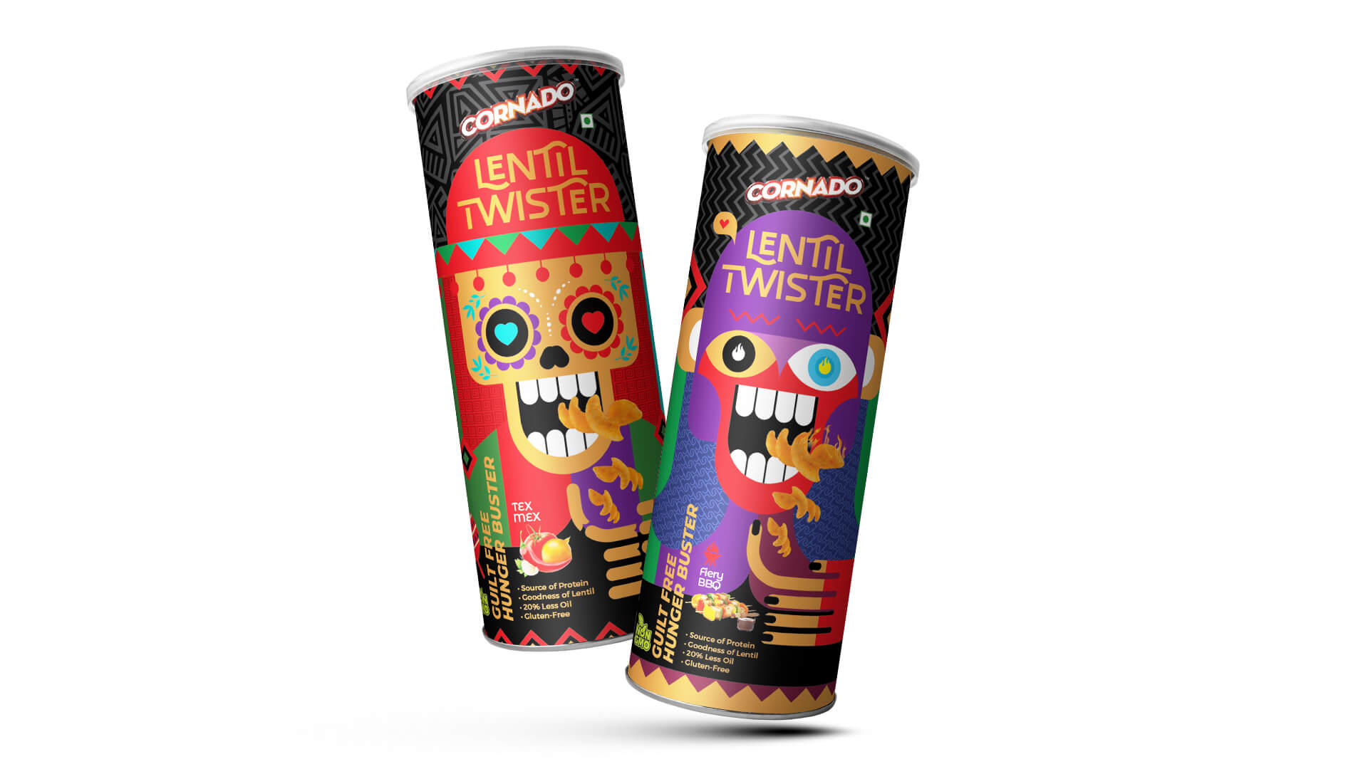 The design for the Tex Mex flavor is a quirky take on Mexican Culture. The Calaca (a figure of a human skull or skeleton commonly used for decoration) is taken as the central feature of the design. Complimenting elements such as the rattle and the tapestry patterns of the famous Salsa dance create a Mexican Carnival feel. The packaging says it loud and clear: Cornado Lentil Twister is a carnival of flavors.